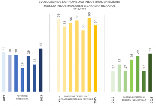 Entre 2019 y 2025, la evolución de la propiedad industrial en Bizkaia muestra un crecimiento sostenido y un papel claramente protagonista dentro de la CAPV. A lo largo de todo el periodo, Bizkaia concentra sistemáticamente la mayor parte de las solicitudes en prácticamente todas las modalidades —patentes, modelos de utilidad, diseños industriales y marcas—, consolidándose como el principal motor de actividad inventiva, creativa y tecnológica de Euskadi. La recuperación registrada en 2025, especialmente intensa en patentes y diseño industrial, marca un punto de inflexión tras los descensos acumulados entre 2022 y 2024 y confirma la capacidad del territorio para adaptarse a ciclos económicos cambiantes.