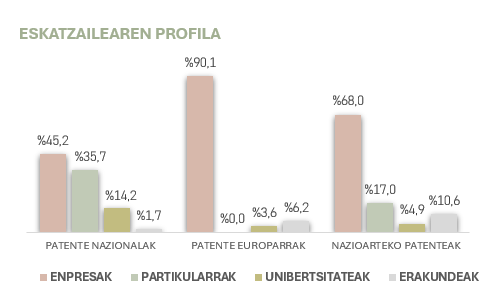 Aunque las solicitudes y concesiones de patentes nacionales continúan descendiendo tanto en Bizkaia como en el conjunto de la CAPV, Bizkaia sigue manteniendo el liderazgo en este ámbito dentro de la comunidad. El 45,2 % de las solicitudes de patentes nacionales presentadas desde la CAPV fueron realizadas por empresas, y un 35,7% por particulares. Esta tendencia apunta a una pérdida de peso relativo de la protección nacional, reflejando así un menor atractivo de esta vía frente a opciones de protección más amplias.