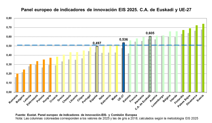 La C.A. de Euskadi obtiene un valor de 0,605 en el Panel europeo de indicadores de innovación –European Innovation Scoreboard EIS 2025-, superior al 0,536 obtenido por la UE-27, según datos elaborados por Eustat.