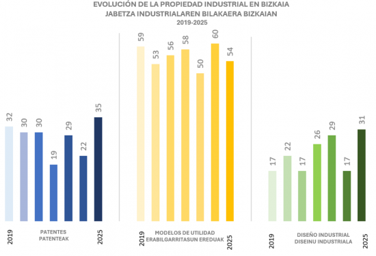 2019 eta 2025 bitartean, jabetza industrialak Bizkaian izan duen bilakaerak erakusten du hazkunde iraunkorra izan dela eta EAEn paper protagonista nabarmena izan duela. Aldi osoan zehar, Bizkaiak sistematikoki biltzen ditu eskaera gehienak ia modalitate guztietan — patenteak, erabilgarritasun-ereduak, diseinu industrialak eta markak —, eta Euskadiko asmatze-, sormen- eta teknologia-jardueraren eragile nagusia da. 2025ean erregistratutako susperraldiak, bereziki handia patenteetan eta diseinu industrialean, inflexio-puntua markatu du 2022 eta 2024 artean metatutako beherakaden ondoren, eta lurraldeak ziklo ekonomiko aldakorretara egokitzeko duen gaitasuna berretsi du.